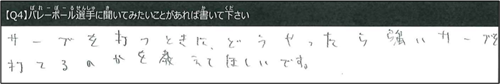 小学6年生:ていねいにバレーボールを教えてくれてうれしかったです。初めてやる練習方法でワクワクしました。とても楽しかったです
