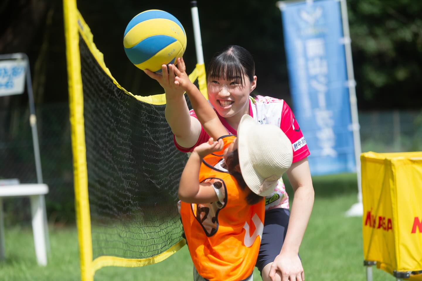 『第15回岡山シーガルズバレーボール教室』がおもちゃ王国敷地内 オートキャンプ場 瀬戸内ナチュラルフィールド で開催され、岡野亜依 選手、松本舞佳 選手、佐伯亜魅加 選手、藤原絢奈 選手...