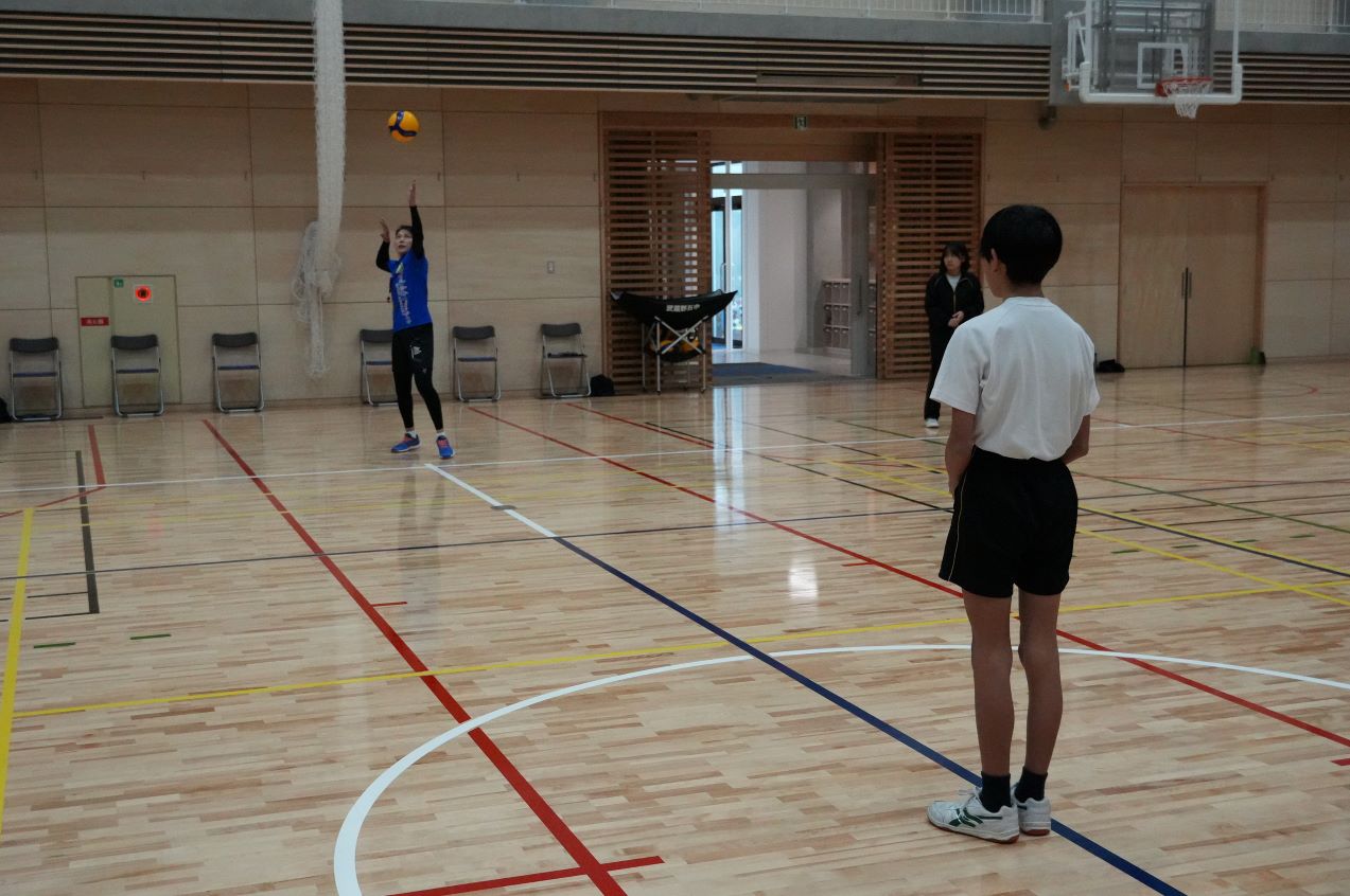 休み時間から早めに体育館にきて、バレーボールを始めた姿が嬉しかったです!ボールが腕に当たって「痛い」と言いながらも、皆さんが本当に楽しく一生懸命にバレーボールに取り組んでくれ、「どうやったら上手くなれますか?」という質問も受け、貴重な時間となりました。これから受験に向かっていくと思いますが、授業の時のような諦めない姿を見せてくださいね!