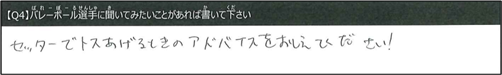 内山さん:いいトスをあげるためには、いいトスのイメージをしながらあげるとよくなります。反対に悪いイメージだとミスしやすくなってしまうのでいいイメージを持ってトスをあげてください。
